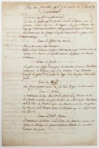 CHÂTEAU DE CHANTILLY (60). «État des curiosités qu'il y a à voir à Chantilly.» Manuscrit de 3pp in-folio du milieu XVIIIe, Essai écrit par un érudit du temps. Intéressante description des lieux: «Les Écuries qui font un jolie morceau. La Salle de Comédie qui est de toute beauté. Le Théâtre a une perspective de huit à dix toises de longueur sur six de largeur. Les loges qui sont aussi très belles sont garnies d'étoffes de Damas vert bordé avec des franges d'argent et au bout des glaces de même ouvrage. Dans le Cabinet des armes. Il y a des armes des sauvages. Toutes sortes d'armes de guerre tant ancienne que moderne avec la cuirasse et le chapeau que portait Monsieur le Prince de CONDÉ à l'armée. .. Dans le Jardin: La Galerie des cerfs, l'Orangerie, le Pavillon de Vénus, l'Ile d'Amour accompagné des différents jeux; d'un balancier, d'une bascule, d'un jeu de galets..., Dans les étangs, Des Carpes pesantes environ 20 à 30 livres et qui sont très vieilles, Dans le petit Château; l'antichambre du Roy, la Salle du Conseil, la Chambre de jeu, la chambre à coucher, le petit boudoir de sa Majesté, l'Antichambre de la Reine, ... La Galerie du Roy où sont peintes toutes les batailles que sa Majesté a faite, la chapelle, Dans le petit Château: L'antichambre du Prince, son salon, la Chambre à coucher, la Cabinent de physique, le cabinet d'histoire naturelle de son Altesse..... Dans le Parc... Dans le Hameau. Dans le Labyrinthe, Dans la Ménagerie...»