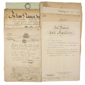 STRASBOURG (BAS-RHIN). ARCHIVE FAMILIALE D'ALSACE. 32 belles pièces de 1760 à 1927: Charles Joseph DUFEUTREL Capitaine d'artillerie, Chevalier de l'Ordre Royal de la Légion d'Honneur, demeurant à STRASBOURG. Et Henriette GRIMM son épouse, fille de Henri GRIMM Notaire et Greffier - en allemand et en français - Nombreux cachets.