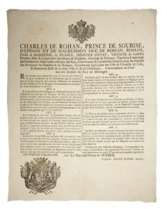 MARÉCHAL DE SOUBISE. 1761 - Arrêté du MARÉCHAL PRINCE DE SOUBISE Commandant en Chef une des Armées du Roi en ALLEMAGNE, fait à Düsseldorf le 29 May 1761 - (Entête à ses nom et titres «Charles DE ROHAN, prince de SOUBISE, d'Epinoy et de Maubuisson Duc de Rohan-Rohan, Pair et Maréchal de France, ministre d'Etat,...») en 7 articles - «Rien n'étant plus important pour le Service de l'armée & pour la facilité de ses opérations que la conservation & le bon emploi des VOITURES destinées au transport de ses subsistances & de ses approvisionnements en tout genre...» - Vignette aux armes et Lettrine -