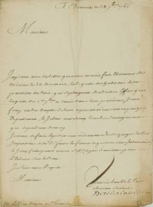Lettre Signée “BALAINVILLIERS”, à CLERMONT (Puy-de-Dôme) le 28 Septembre 1765 - à M. le Duc d'AYEN à ST GERMAIN - 1p in-4°. “J'ai reçu avec la lettre que vous m'avez fait l'honneur de m'écrire le 20 de ce mois, la requête des habitants de la Paroisse de CROS (63), qui se plaignent des tristes effets que la grêle du 1er Septembre a causé dans leur paroisse. Je me ferai rendre compte de leurs représentations à mon prochain Département, et je leur accorderai tous les soulagements qui dépendront de moi.»