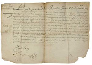 Provisions de l'Office de Lieutenant de Roy de la ville de VILLEFRANCHE DE ROUERGUE en faveur du Sieur de ROQUIÈRE. Pièce signée du Roi LOUIS XV (Secrétaire) contresignée Louis PHELYPEAUX Secrétaire d'État, Fait à Versailles le 9 Janvier 1768. Brevet en parchemin (36 x 52). En-tête gravé «LOUIS, par la grâce de Dieu, Roy de France et de Navarre.»