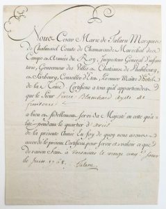 Certificat signé à son en-tête gravé à ses Nom et titres. Versailles (Château de) le 25 Juin 1768. Certifions que le Sieur BLANCHARD Aide de Fruiterie a bien et fidèlement servi Sa Majesté. 1p in-4°. Marges réduites.