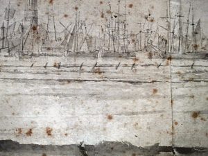 (École hollandaise) — [Cercle de Van De Velde, Willem Ii (1633- 1707)].- Paysage fluvial. Dessin original, plume, pinceau et lavis à l'encre grise, sur papier vergé, 12 x 79 cm (nombr. rousseurs, 3 pet. déchirures marginales sans perte). Sous...