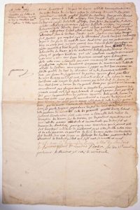 Convention et transaction entre l'Abbé de MÉNÉTRÉOLS (36) et l'Abbé et les Religieux du LANDAIS portant 200 Livres de supplément de portion congrue. Pièce signée des parties: L'Evêque de LUÇON, Abbé Commendataire de Notre-Dame du Landais, Ordre de Cîteaux, diocèse de Bourges, du Prieur de l'Abbaye du Landais, du Frère de St Martin et du Curé de Ménétréols. «Fait double, sous nos seings en l'Abbaye du Landais paroisse dudit Ménétréols le 18 Juillet 1769.» Papier (38 x 25) (Le haut clergé recevait une taxe dont il redistribuait au bas clergé une toute petite partie qui s'appelait la portion congrue.)
