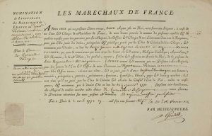 Gaspard, Duc de CLERMONT-TONNERRE, Maréchal de France en 1747. (ILLE-ET-VILAINE) Pièce signée «le Maréchal de TONNERRE». Nomination de Lieutenant des MARÉCHAUX DE FRANCE au Département de RENNES (35) et environs pour le Sieur de QUERMADEUC DE CARGOÜET - Fait à Paris le 2 avril 1773 - Brevet sur papier (40 x 26), imp. rempli à l'encre. Sceau sous papier.