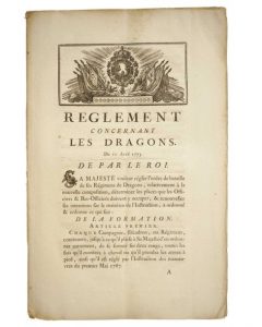 CAVALERIE ET DRAGONS. 2 RÈGLEMENTS imprimés in-folio: «RÈGLEMENT concernant la CAVALERIE. Du 10 avril 1773.» Impr. 14 pages in-folio; à VERSAILLES, de l'Imprimerie du département de la Guerre; 1773 (en 49 articles; Complet de sa planche dépliante: «Formation d'un Régiment de Cavalerie en Bataille.») + «RÈGLEMENT concernant les DRAGONS. Du 10 avril 1773» Impr. 15 pages in-folio; à VERSAILLES, de l'Imprimerie du département de la Guerre; 1773. (en 56 articles; Complet de sa planche dépliante: «Formation à cheval d'un régiment de Dragons en Bataille.» «Formation à Pied d'un Régiment de Dragons en Bataille.»).