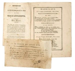 LOUIS XVI et MARIE-ANTOINETTE. 3 Documents: «MADRIGAUX sur la naissance de MADAME, Fille du ROI. Au Roi (Louis XVI), à la Reine (Marie-Antoinette) «Digne épouse d'un Roi que tout Paris adore..», à la jeune Princesse, Madame, Fille du Roi, Sur le Baptême de la jeune Princesse, à mes vers adressés à M. de LASSONNE premier Médecin de la Reine... par l'Abbé L.M. TOURNEFORT, Curé de Villes, achevés le jour des Rois 1779.» - Impr. 4pp (25 x 20) + Quittance de souscription de l'Ouvrage intitulé: «LE RÈGNE DE LOUIS XVI». Fait à PARIS le 2 Mars 1790. Impr. rempli à l'encre (13 x 21) + «Souscription pour le grand portrait en pied de la Reine MARIE-ANTOINETTE.» (Second prospectus). Impr. 3pp (20 x 12)