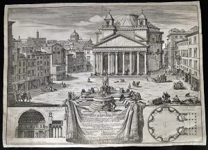 (École italienne) — 1 vue d'architecture romaine et 1 vue d'optique de Milan. ROSSI, Domenico de.- "Piazza e Tempio di Santa Maria della Rotonda gia l'antico Pantheon". Rome, Gio. Giac. de Rossi, 1693. Grav. sur cuivre, TC 46,5 x 65,5 cm + marges....