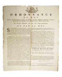 ROUSSILLON 1785. ARMÉES DE LOUIS XVI «Ordonnance du Roi, portant AMNISTIE générale en faveur des SOLDATS, CAVALIERS, HUSSARDS, DRAGONS, & CHASSEURS qui ont déserté des Troupes de sa Majesté avant le 1er Janvier 1785.» - du 17 Décembre 1784 - Vignette Royale - Publié par Louis-Hyacinthe RAYMOND DE ST SAUVEUR, Intendant de Justice, Police, Finances & fortifications de la Province du ROUSSILLON, fait à PERPIGNAN (66), le 11 Janvier 1785 - Impr. à Perpignan, chez REYNIER, Imprimeur du Roi, rue St Jean.