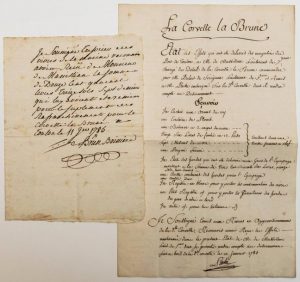 MARINE. 1785. Corvette “LA BRUNE”: “État des effets qui ont été délivrés des magasins du Port de TOULON (83) pour M. DELORT de SERIGNAN, Lieutenant de Vaisseau chargé du détail de la Corvette LA BRUNE... savoir: (1 cachet aux armes du Roy, un écritoire de plomb, une balance à 2 coupes de cuivre... un état des hardes qui sont délivrées aux gens de l'équipage.. 1 registre pour y porter les consommations des vivres, 1 petit registre pour y porter les inventaires des hardes de gens décédés à bord..) - Pièce signée PIECHE Commis aux Revues et approvisionnements de ladite Corvette... dont je promets rendre compte au désarmement.. - Fait à bord, le 10 janv. 1785 - 1p in-folio - On joint: Billet in-8°. Supplément des rafraîchissements pour la Corvette, Toulon 11 sept 1785.
