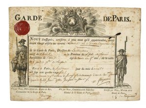 «GARDE DE PARIS» de LOUIS XVI - Congé absolu au nommé Louis LE BRUN Caporal de la Garde de Paris, Division de LA THUILLIÈRE. Fait à PARIS le 7 Avril 1786 - Pièce signée des Officiers - 1 page gravée rempli à l'encre, (21 x 29), illustrés d'un Cavalier et d'un Fusilier, doublée de parchemin. Sceau de cire du Régiment.
