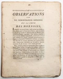 MONNAIE. 1788. «Observations sur LES REMONTRANCES imprimées de la Cour des Monnaies.» Impr. 120 pp in-4°. Exemplaire non rogné. (Des monnaies en général, de la Fabrication des monnaies d'or, Fonctions des Officiers de la Cour des Monnaies, limites de leur compétence, des Directeurs & trésoriers; Exposition des faits qui ont eu lieu à l'occasion de la refonte des Louis & depuis cette refonte, Incompétence de la Cour des Monnaies, justification 1786...)