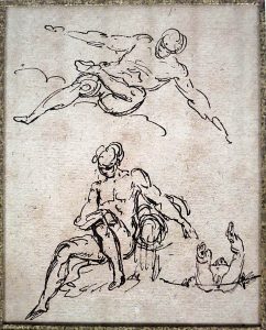 (École italienne) — Trois études d'hommes nus : assis, penchant vers la gauche et tombant en arrière. Fin 18e siècle. Dessin original, plume à l'encre bistre, 12,5 x 10 cm à vue, sur papier légèrement foncé. Sous large passe-partout...