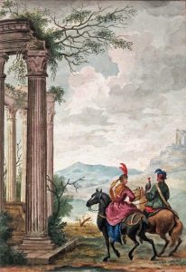 moitié du 18. siècle. Aquarelle originale, sur papier vergè non fiiigrané, 15,8 x ii cm.— DELLA BELLA, Stefano (1610-1664).- Chasse aux cerfs. Eau-forte, cuv. 14,9 x 2,5 cm (rognée en dega de la cuv.).— FALDA, Giovanni-Battista (1648-1678).- Deux fontaines. Eau-forte, cuv. 35,5 x 24,2 cm. (rognée en dega de la cuv.).— VITALI, Pietro (c. 1755- c. 1810).- "Silentium et tenebras Amor [...]". [D'après Guido RENI]. Eau-forte, 29 x 21 cm + très grandes marges (plis).