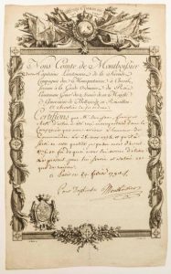MOUSQUETAIRES DU ROI LOUIS XVI. Certificat de service militaire dans les Mousquetaires du Roi signé par le Comte de MONTBOISSIER (1790, beau décor gravé). Paris 29 Février 1790. En-tête «Comte de MONTBOISSIER (ci-devant) Capitaine Lieutenant de la Seconde Compagnie des Mousquetaires à cheval, servant à la Garde Ordinaire du Roi, Lieutenant Général... & Gouverneur de BELLEGARDE en Roussillon.» 1 page gravée (35,5 x 22 cm) remplie à l'encre.