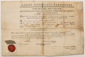 RÉVOLUTION 1790. Brevet de Volontaire dans la GARDE-NATIONALE-PARISIENNE délivré à Jean COUTURE Imprimeur rue du four, N°2, natif de l'Aigle (Orne) en Normandie. «Il est Soldat, Citoyen-Volontaire dans la 4e Compagnie du Bataillon de SAINT-ÉTIENNE-DU-MONT, qui est la première division des Gardes-Nationales-Parisiennes.» Donné à PARIS le 1er Septembre 1790. Signatures.