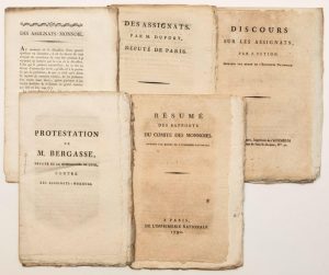 DES ASSIGNATS-MONNAIE. 1790. RÉVOLUTION. 5 Imprimées in-8° «Résumé des Rapports du Comité des Monnaies.» «la Loi et le Roi» Imprimé par ordre de l'Assemblée Nationale. A Paris, de L'Imprimerie Nationale, 1790. Impr. 26 pp in-8°. Exemplaire non rogné. + Nicolas BERGASSE. «Protestation de M. BERGASSE, Député de la Sénéchaussée de LYON, contre les ASSIGNATS-MONNAIE.» Impr. 44 pp in-8°. Exemplaire non rogné - «Peut-être, au reste, est-il réservé à M. Anson de prouver qu'au temps de Law on n'agiotait pas du tout. J'aurais voulu traiter encore de l'influence funeste des Assignats forcés sur nos Iles à sucre...» + Jérôme PÉTION. Sept 1790 «Discours sur les ASSIGNATS, par J. PÉTION.» Imprimé par ordre de la Convention Nationale.21 pp in-8°. Il adopte le projet de MIRABEAU sur les Assignats, sans amendements. «Les Assignats doivent-ils être forcés ?» Jérôme PÉTION de VILLENEUVE (Chartres 1756-1794) Avocat et Révolutionnaire, Maire de Paris de 1791 à 1792.