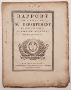 SAÔNE-ET-LOIRE. 1790. «RAPPORT DU DIRECTOIRE DU DÉPARTEMENT DE SAÔNE-ET-LOIRE, au Conseil Général assemblé le 4 Novembre 1790. Imprimé à Châlons-sur-Saône, de l'Imprimerie de Delorme Delatour, Imprimeur du Roi et de la Ville; 48pp in-4°. Vignette «La Loi et le Roi» (Louis XVI).