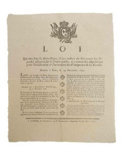 LES VAINQUEURS DE LA BASTILLE. 1790. «Loi qui met sous la surveillance & les ordres du Roi (Louis XVI) toutes les dépenses assignées sur le Trésor public, & contient les dispositions pour l'habillement & l'armement des Vainqueurs de la Bastille.» - Données à PARIS, le 19 Novembre 1790 - Publié par l'administration du Département de la Charente inférieure, à Saintes le 12 Décembre 1790 - Vignette Royale - Impr. à SAINTES, de l'imprimerie de P. Toussaints, Imprimeur du roi, rue S. Maur.