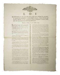 (ABDICATION DU ROI LOUIS XVI) 1791 «Loi qui détermine les cas où le Roi (LOUIS XVI) sera censé avoir abdiqué la Couronne, & pourra être poursuivi comme simple citoyen, & qui ordonne que le Sieur BOUILLÉ & ses Complices seront poursuivis comme criminels de LÈZE-NATION au tribunal d'Orléans.» - Donnée à Paris le 16 Juillet 1791 - «1°) Si le Roi, après avoir prêté son Serment à la Constitution, le rétracte, il sera censé avoir abdiqué. 2°) Si le roi se met à la tête d'une armée pour en diriger les forces contre la Nation, ou s'il ordonne à ses généraux d'exécuter un tel projet,... il sera censé avoir abdiqué. 3°) Un Roi qui aura abdiqué, ou qui sera censé l'avoir fait, redeviendra simple citoyen, & sera accusable, suivant les formes ordinaires, pour tous les délits postérieurs à son abdication...» (en 9 articles)