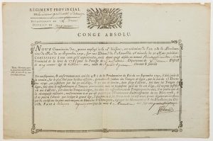 ORNE. 1791. «RÉGIMENT PROVINCIAL de la Ci-devant Généralité d'ALENÇON. District d'ARGENTAN». Congé Absolu pour Nicolas ROÛILLER Soldat provincial de la levée de 1785 pour la Paroisse de LA BELLIÈRE (Orne) - Fait à Alençon le 15 décembre 1791. Pièce signée FÉRAUD Commissaire des Guerres employé à la 14° Division - Décoratif - Vignette - 1p in-folio oblong en partie imp.