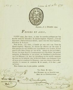 “Nous devons, à la vérité, à l'amitié qui nous unit à nos frères du Quatre-Vingtième Régiment, ci-devant Angoumois (accusé d'avoir lâchement déserté, ayant à leurs têtes deux Capitaines, Chevaliers de St-Louis.) ... & dans les circonstances ou des rebelles menacent de porter un fer homicide dans le sein de la Patrie, non seulement il n'en est aucun qui ait abandonné ses Drapeaux, mais tous, fermes à leur poste, attendent le moment de combattre & de mourir, s'il le faut, pour la Liberté.” (petit cachet de collection)