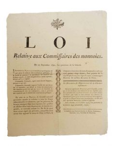 (DANTON. MONNAIE. CHARENTE MARITIME) «LOI relative aux Commissaires des Monnaies.» signé LEBRUN contresigné DANTON - du 20 Septembre 1792. Publié par le Directoire du Département de la Charente Inférieure, à SAINTES le 16 Octobre 1792 - Impr. à SAINTES, chez Vincent CAPPON & Michel MARESCHAL, imprimeurs, 1792. Vignette Révolution.