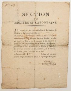 Pièce signée du Secrétaire-Greffier de la Section de Molière et Lafontaine. - 1p in-4°, en partie imp.
