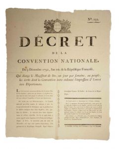 IMPRESSION DES LOIS. GARAT «Décret de la CONVENTION NATIONALE, du 9 Décembre 1792, l'an 1er de la République Française, qui charge le Magistrat de lire, un jour par semaine, au peuple, les écrits dont LA CONVENTION aura ordonné l'impression & l'envoi aux Départements.» GARAT - N°232 - Publié par le département de la Charente Inférieure _ Impr. à SAINTES, chez P. Toussaints, Imprimeur du Département. - Vignette Révolutionnaire.