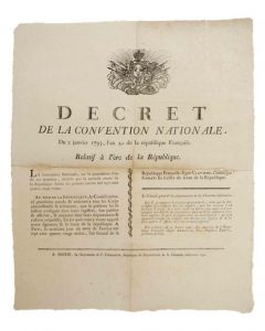 CRÉATION DU CALENDRIER RÉPUBLICAIN. CHARENTE MARITIME - «Décret de la Convention nationale, du 2 Janvier 1793, an 2, relatif à l'Ère de la République.» CLAVIÈRE & GARAT. «La Convention Nationale,... décrète que la seconde année de la République datera du premier Avril 1793...» - Vignette Royale - Impr. à SAINTES, chez P. Toussaints, imprimeur du Département de la Charente Inférieure.
