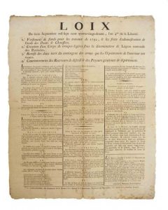 AUDE. «LOIS du 16 Septembre 1792, l'an 4 de la Liberté.» «1°) Versement de fonds pour LES TRAVAUX de 1792, & les frais d'administration de L'ÉCOLE DES PONTS & CHAUSSÉES. 2°) Création d'un Corps de troupes légères sous la dénomination de LÉGION NATIONALE DES PYRÉNÉES. 3°) Remise des deux tiers du contingent des armes que les départements de l'intérieur ont reçues. 4°) Cautionnement des Receveurs de district & de Payeurs généraux de département.» MONGE & DANTON. Publié par le Département de l'AUDE, CARCASSONNE 22 Janvier 1793. Impr. à CARCASSONNE, de l'Imprimerie de P. Polere, J. J. Teissié & J. Chartrand, imprimeurs du Département, An premier de la République française.