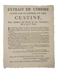 CUSTINE. LILLE (59) le 6 Juin 1793, An 2. «Extrait de l'Ordre donné par le Général CUSTINE, aux Armées du NORD & des ARDENNES, du 5 au 6 Juin (1793).» «Il est défendu à qui que ce soit, de quelque grade qu'il puisse être, sous peine d'être fusillé, de donné des Congés absolus ou limités, nuls motifs ni raisons ne pouvant être valables en temps de guerre pour en obtenir. Tout homme qui sera repris fuyant ou favorisant la fuite d'un Soldat, sera fusillé sur le champ & sans aucune forme de procès... Tout homme qui à dater du jour de la connaissance du présent ordre aurait une permission pour aller aux eaux, & tout commissaire qui l'aurait autorisé par sa signature, sera fusillé.» le Général de Division LAMARLIERE Commandant à LILLE & arrondissement. Reçu pour tenir main à l'exécution; LAVALETTE Le Général de Brigade Commandant à LILLE. - LILLE (59) le 6 Juin 1793, an 2.