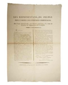 APPEL AUX ARMES CONTRE L'ENTRÉE DES ESPAGNOLS EN FRANCE en 1793 - PERPIGNAN (66) 25 Frimaire An 2 (15 Déc. 1793). «Les Représentants du Peuple près l'Armée des PYRÉNÉES ORIENTALES (FABRE, GASTON, CASSANYES), aux Corps Administratifs, aux Sociétés Populaires, & à tous les Citoyens des Départements de la division.» «Citoyen. Les Grands revers sont souvent le prélude de la prospérité... l'armée des Pyrénées Orientales, en proie à la machination des Muscadins, des intrigants de toute espèce, tend vers la désorganisation... Depuis 8 jours notre armée a perdu les fameuses positions de VILLELONGUE & du MAS-DE-LA-FERRA; plus de 20 pièces de canons sont tombées entre les mains de l'ennemi; sa cavalerie se promène insolemment dans la plaine des Pyrénées Orientales, & nous n'en avons pas à lui opposer. Les forces Espagnoles sont aux portes de PORT-VENDRES; si elles s'avançaient encore, elles feraient craindre pour nos communications entre COLLIOURE & PERPIGNAN, entre PERPIGNAN et BANYULS-D'ELS-ASPRES. Cette position n'est sans doute pas désespérée mais elle est très affligeante... Braves frères d'armes, généreux citoyens, volez à la voix de vos représentants qui vous appellent au combat... LA VICTOIRE OU LA MORT, c'est là le mot de ralliement...; Levez-vous, partez, il est temps; les satellites des Tyrans s'avancent...»