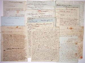 HÉRAULT, GERS. Commerce de PLUMES (duvet de Volaille) venant du GERS. 28 Lettres commerciales adressées à Françoise GUY née BRUN, à MONTPELLIER (34). De l'An 2 (1794) à 1808. Lettres de Lorient (2), Condom (4), Mirande (4), Toulouse (10), Livourne (7), Nimes, et Montauban. «Lorient 5 Pluviôse An 2: Problème avec un Assignat, reconnu faux par le Commissaire vérificateur de paris. Peu de Poivres, Ceux que la Compagnie a sont saisis par le Gouvernement ainsi que les Autres marchandises...» Mirande 1807, Envoi de balles de plumes d'oie et de plumes de canards «C'est actuellement le moment qu'on tue les belles oies et qu'un chacun s'empresse à venir me vendre leurs plumes, tous enchantés de me donner la préférence, ce qui m'engage à faire ce petit commerce et les messieurs de Bordeaux me prie de lui acheter toute la plume qu'il me sera possible, qu'ils viendront eux mêmes la recevoir chez moi au commencement de janvier..; Je dois vous observer que la plume que nous achetons à présent on l'appelle Plume grâce et celle que nous achèterons après pâques Plume sèche, parce qu'on déshabille ses pauvres bêtes 3 fois l'année en vie... actuellement nous avons un temps superbe... et 600 hommes de cavalerie, nous en avons logé 4 avec leurs chevaux et aujourd'hui 1000, tous vont donner secours au Roy d'Espagne, notre Allié...» « Livourne 1798 ...Les Assureurs sont extrêmement rebutés, les Corsaires Français arrêtent même les Neutres jusque sous le canon de la Forteresse... nous espérons que vu le prix des factures, vos 3 balles vous rendront un résultat satisfaisant...» «Livourne 1798... les Corsaires dont nous sommes environnés ne respectent rien. Ils trouvent toujours quelque raison pour colorer une arrestation même injuste & le moindre mal qui puisse arriver, c'est de leurs accorder une somme pour transiger avec eux...»