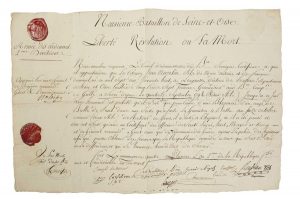 «ARMÉE DES ARDENNES, 2° Division.». «FORT LA MONTAGNE» (Nom révolutionnaire de CHARLEMONT Ardennes) ce 4 pluviôse an 2 (23 Janvier 1794) - Certificat de services signée des membres du 9 Bataillon de SEINE ET OISE (13 signatures) & du Général Commandant à GIVET & l'Arrondissement NALÈCHE (Gilbert-Jacques Bandy de; Felletin /Creuse 1756-1820 ) - Attestation pour Jean ANCELIN né à Longuesse (Pontoise) Grenadier, a servi depuis 14 Sept 1792 jusqu'à ce jour avec honneur et probité, blessé d'un coup de Balle de fusil dans une sortie qu'a faite la Garnison à Bossu (BOSSUS LES RUMIGNY/08) 16 octobre dernier... - “Liberté, Révolution ou la Mort” (En-tête manus.) - 2 Cachets de cire. 1 page (45 x 30).
