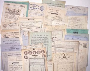 LE MANS (SARTHE) RARE COLLECTION DE 127 FACTURES DE LA VILLE DU MANS de l'An 2 (1794) à 1877. Presque toutes différentes, aux en-têtes imprimés des Commerçants de la Ville du Mans. Tous formats: «AU GRAND PONT-NEUF, Au Mans, DUBOIS, Marchand Drapier, An 2 et An 3 + POUPLIN marchand, 13 Place de l'Eperon, Le Mans 1820 + MUREY, Marchand de Draps, 2 Place Saint-Nicolas, le Mans 1822 + COQUERET-LECHESNE marchand drapier au Mans, rue St Jacques, 1824 + ROCHE tient Magasin de toutes sortes de fils, 3 rue du saumon, au Mans 1824 + «A LA SIRÈNE» BEAURY, 6 rue de la Barillerie, tient un magasin assorti de draps, casimirs et velours... Au Mans 1825 + «AU PRIX FIXE» MÉTIVIER, orfèvre au Mans, 25 rue Marchande 1825 + PELLIER Fils, Marchand de Meubles et tapissier, Miroitier, 5 Place Saint Nicolas, le Mans 1826 + JONIAUX Marchand Poêlier, 8 Place de l'Eperon, au Mans, 1828 + DERRÉ, Frères, Marchands de Mercerie, Bonneterie, 18 rue du Saumon, le Mans 1830 + LEZOUX Marchand de Vins en gros, à l'Arche , près le Mans 1832 + Prosper VOISIN Tapissier, Marchand de Meubles, Grand Rue, le Mans 1832 + VITALIS Peintre en décors et en bâtiments, tient magasin, 17 rue Marchande, a Mans 1833 + FERARD Ébéniste et Tapissier, 6 rue Saint Jacques, au Mans 1833 + HOUDAYER 20 rue St Jacques, Draperies en tous genres et Nouveautés pour gilets. Au Mans 1835+ LEGEAY, Marchand, rue Saint-Vincent, au Mans, Tient Rouennerie, draps d'Elbeuf..; 1840 + Mme SARAZIN, tient Magasin de modes et lingerie, Rue St Dominique, le Mans 1840 + DESGRAVIERS, draperies, Soieries, Mérinos..; 8 rue de la Perle, le Mans 1841 + MAZIER-VERRIER Roulage, le Mans 1845 + BOURDELOIS, Fabrique & magasins de Papiers peints, 4 Rue Royale, au Mans 1849 + LAINÉ-GALPIN, 15 Place des Halles, au Mans, Mercerie, Soierie, 1856 + DUNIAL Mécanicien breveté, au Mans, Place Saint-Pierre, 1865 + Melle POUPLIN, Place de l'Etoile, Spécialité de Toiles, le Mans 1869 + LEBALLEUR Magasin de Papiers peints, 13 rue St Dominique au Mans 1860 + DAVID 7 Place St-Nicolas, Bijouterie, Ornements d'églises, le Mans 18.. + CH. LENOIR, Maison de Nouveautés, 1 rue de Paris, le Mans 1869, etc...