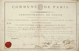 «COMMUNE DE PARIS. Administration de POLICE» - Nomination du Citoyen DIDIER, demeurant Section des Amis de la Patrie, à la Place de CHIRURGIEN pour exercer ses fonctions, dans toutes les Maisons d'Arrêts et de Santé. - Pièce signée des Maire et Officiers municipaux administrateurs de POLICE - Fait au Département de Police le 1er Pluviôse an 2 (20 Janvier 1794) - Vignette “Commune de Paris.” et Cachet de cire.
