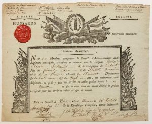 HUSSARDS. VITRY-SUR-MARNE (51) 26 ventôse An 2 (16 Mars 1794). Certificat d'existence de Nicolas CLAPIN Hussard au 9ème Régiment d'HUSSARDS. Né à Arc-en-Barrois, district de Chaumont, HAUTE-MARNE. Brevet décoratif (21 x 26), Cachet de cire du «9e Régiment d'Hussards».