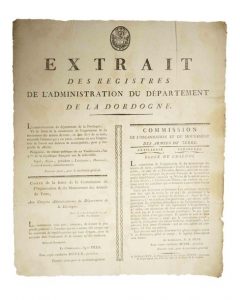 DORDOGNE. ÉCOLE DE CHALONS (51) - Extrait des registres de l'Administration du Département de la DORDOGNE. Périgueux, en séance publique du 27 Vendémiaire an 3 (18 Oct. 1794) - Grande publicité pour l'École de CHALONS. «Il sera ouvert, à Châlons-sur-Marne, un examen au concours pour les candidats qui se destinent à entrer dans l'arme de l'artillerie.» - Vignette «Droits de l'homme.» - Impr. à PÉRIGUEUX, de l'Imprimerie du Républicain DUPONT, imprimeur du Département, au Club des Amis de la Liberté & de l'Égalité. -