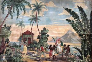 règles de bois doré. Dans un décor à la végétation luxuriante, un couple de jeunes mariés (?) européens est porté par des esclaves noirs vers une cabane où deux femmes les accueillent.