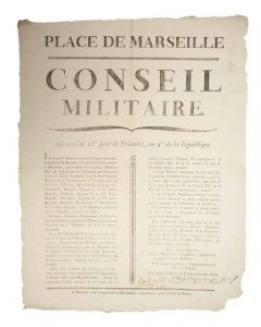 Pièce signée LECLERC, au bas d'un Placard, pour copie conforme, l'Adjudant-Général LECLERC Commandant la Place de MARSEILLE en état de Siège. «Le CONSEIL MILITAIRE de la Place de MARSEILLE», le 22 Frimaire an 4 (13 Déc. 1795), déclare que le Citoyen SALUS, natif de Tarascon (13), TAMBOUR en subsistance dans le Bataillon des GRENADIERS, accusé d'avoir volé une paire de souliers à un de ses camarades, l'a condamné à 4 ANS DE FERS.