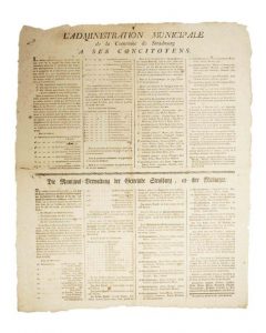 STRASBOURG (BAS-RHIN) 1798. ASSEMBLÉES PRIMAIRES -«L'Administration Municipale de la Commune de STRASBOURG, à ses Concitoyens.» Fait en séance publique à Strasbourg le 27 Ventôse an 6 (1798) - «Dans la Commune de Strasbourg, les Assemblées primaires restent fixées pour cette année au même nombre» pour la nomination de l'Assemblée électorale, 2° Des juges de paix et de leurs assesseurs; 3° Des officiers municipaux dans les communes de plus de cinq mille habitants.... Suit le Tableau: 1° Assemblée primaire de la Réunion, le Temple d'Aurélie. 2° Assemblée primaire de l'égalité, le ci-devant poële des Jardiniers. 3° Assemblée primaire de la Victoire, le Temple de Pierre le Jeune. 4° de la Liberté, le Temple de Pierre le Vieux. 5 ... de la Bienfaisance, la ci-devant Tribu des drapiers. 6° ... de la Fraternité, le Temple neuf. 7° ... de la République, le bâtiment du ci-devant Directoire de la Noblesse. 8° ... de la Maison Commune, maison Commune. 9° ... de la monnoie, l'Oratoire helvétique, (...) 12°... le Jardin des plantes, le Temple de Guillaume.» - Impr. à Strasbourg.