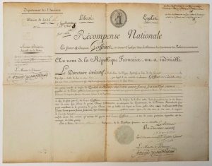 BREVET DE RÉCOMPENSE NATIONALE en faveur de Jacques GOFFINET ci-devant Employé dans les Bureaux du Département des Relations extérieures - Pièce signée du Président du Directoire Exécutif: BARRAS Paul-François-Jean-Nicolas, vicomte de (1755-1829 Capitaine; Conventionnel du VAR), LAGARDE Le Secrétaire Général & FRANÇOIS DE NEUFCHÂTEAU Ministre de l'Intérieur - Fait à Paris 8 floréal an 7 (27 avril 1799) - (56 x 43) en partie imp. Vignette et sceau sous papier.