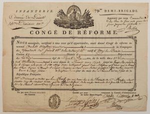 ILLE ET VILAINE. ARMÉE DE L'OUEST. PLACE DE SAINT MALO. Congé de Réforme donné à Charles MASSON Grenadier à la 79° Demi-Brigade d'Infanterie, natif d'IVRY LA BATAILLE (EURE), blessé - Fait à SAINT-SERVAN le 20 Prairial An 8 (9 Juin 1800) - P.S. du Conseil de la Demi-Brigade & du Commandant de la Place de SAINT-MALO (ILLE ET VILAINE) - 1p grand in-folio obl., imp. rempli à l'encre, Belle vignette, Décoratif.