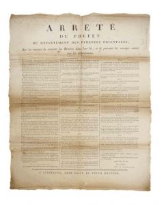 2 Placards sur PYRÉNÉES ORIENTALES Imprimés à PERPIGNAN, chez TASTU et veuve REYNIER. - 1°) Arrêté de CHARVET préfet des Pyrénées Orientales sur le moyens de contenir les Rivières dans leur lit, et de prévenir les ravages causés par les débordements - PERPIGNAN (66) le 15 thermidor an 8 (3 août 1800)- (55 x 43) Etat B + 2°) Arrêté du Préfet du département des Pyrénées Orientales, concernant la police des Bois et Forêts. PERPIGNAN (66) le 29 thermidor An 8 (52 x 42; défaut)