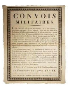 LOT ET GARONNE. «CONVOIS MILITAIRES.» à AGEN le 1er Germinal An 9 (1801). Le Commissaire des Guerres TAPIES. «Les citoyens sont averti que, le 19 du courant, à 11 heures du matin, il sera procédé à l'adjudication au rabais de la Fourniture des Convois dans tous les lieux de logement militaire du département de Lot et Garonne, pour le service des six derniers mois de l'an 9...»