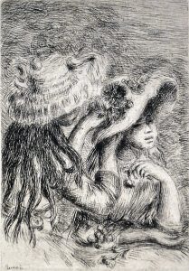 Renoir, Auguste (1841-1919).- 3 estampes : Sur la plage à Berneval.— Le chapeau épinglé [i.e. la fille de Berthe Morisot et sa cousine].— Baigneuse debout, à mi-jambes. [C. 1892, 1894 et 1910]. Eaux-fortes en noir, cuv. 11,5 x 7,5 cm, 11 x 8...