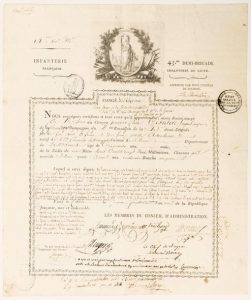 VIGNETTE. CALVADOS. Congé signé par le Général de Division LA BAROLIÉRE et du Conseil du 43ème Demi-Brigade d'Infanterie de Ligne. (an IX), du chef de Brigade Raimond VIVIÈS (Futur Général). Fait à CAEN (14) le 1er fructidor An 9. (19 août 1801). Congé de réforme au citoyen Prosper Félix TERNIÈRE, sergent-major de Grenadiers, natif de Saint-Laurent-de-Tergatte (Manche), âgé de 50 ans, lequel a servi depuis le 3 mai 1769 il a fait les Campagnes de guerre de 1782 à l'an 9. Brevet gravé (41 x 35), rempli à l'encre. Superbe vignette gravée.
