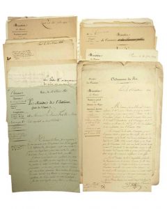 Ensemble de 50 LETTRES SIGNÉES, L.A.S. ou Pièces concernant ses nominations et sa correspondance de l'An 10 (1802) à 1845: (Lettres signées de MONTALIVET, Ministre de l'Intérieur, qui lui donne Avis de sa nomination à la Préfecture de Jemmapes; Lettres de LAUMOND Préfet; Baron de LA BOUILLERIE; de ROY Ministre, de MARTIGNAC Ministre, de VILLÈLE Ministre; BOREL DE BRETIZEL; Baronne d'ACHÈRES, de CHABROL Ministre; Jacques LAFITTE Ministre; Copie de l'Ordonnance de LOUIS-PHILIPPE qui le nomme Baron de FRÉVILLE Pair de France et Conseiller d'Etat; Lettres de HUMANN Ministre, PASQUIER Président de la Cour des Pairs; MARTIN (du NORD) Garde des sceaux; DUCHÂTEL Ministre; MARTINEAU Conseiller d'État; D'ARGOUT Ministre; LOUIS Ministre; Copie de lettres adressées au Comte de CORVETTO; Le Baron de FRÉVILLE; Manuscrit pour un article Biographique, etc.) - (Jean Baptiste Maximilien VILLOT DE FRÉVILLE (Paris 1773 - 1847) fut Maître des requêtes (1808), Préfet de Jemappes (1811), Conseiller d'État (1828), Préfet de Vaucluse, puis de la Meurthe, Agent diplomatique, à Turin, Vienne et Madrid, Membre du Tribunat. Chevalier (1808) puis Baron de l'Empire (1809), Pair de France (1832).