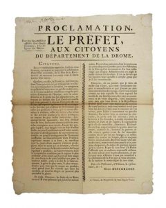 DRÔME. «PROCLAMATION du Préfet Marie DESCORCHES, aux citoyens du Département de la DRÔME.» - fait à la préfecture, à VALENCE, le 15 Fructidor An 11 (2 Sept. 1803) «Citoyens, le 1er Vendémiaire approche. La Loi, vous le savez, a consacré un jour pour la Célébration d'une fête nationale, de LA FÊTE DE LA RÉPUBLIQUE, et surement vos cœurs vous le disent encore bien mieux...» - Impr. à VALENCE, de l'imprimerie de Jean-Jacques VIRET.